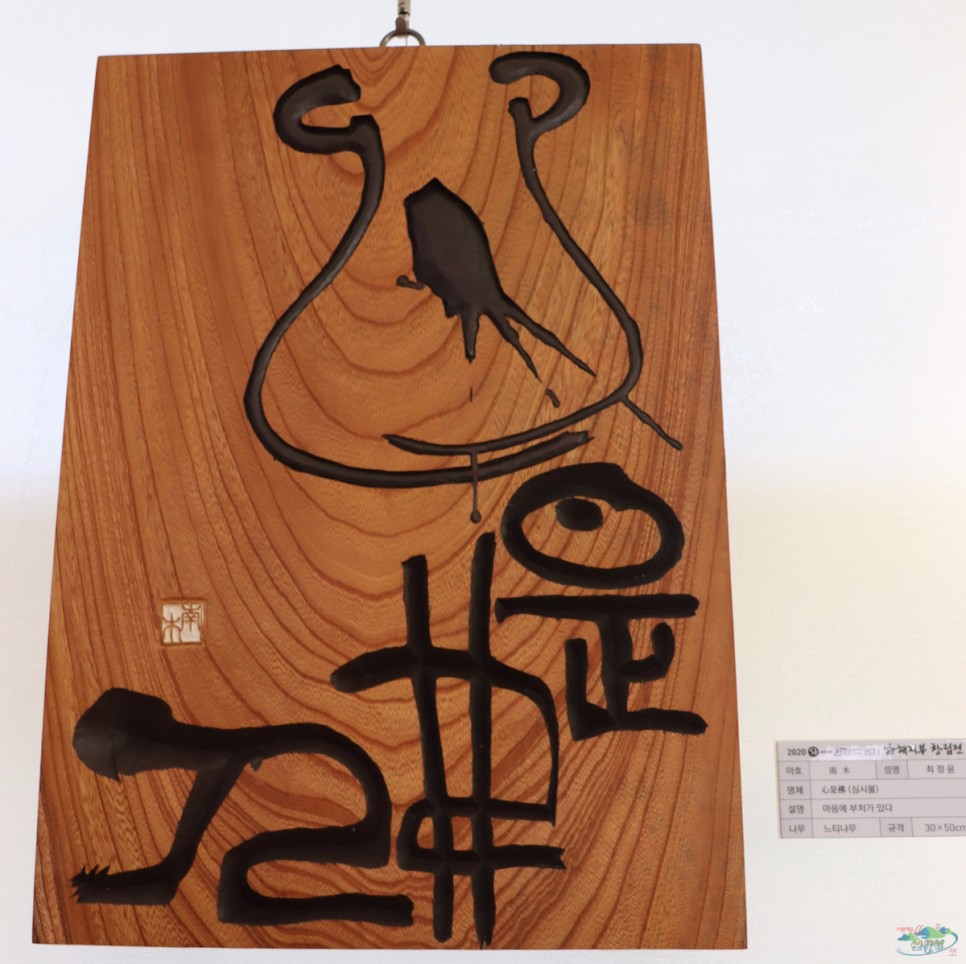 보물섬남해타악예술단 담술에서도 색다른 기량을 선보이는 류권주 회원의 서각작품 순수를 꿈꾸며의 작품 하단에는 커피 가루를 사용했다고 한다.우리를 고통 속에 몰아넣은 코로나19 바이러스 대혼란 속에서도 무거운 칼과 망치를 들고 조용히 말이 주는 의미와 이야기에 집중하며 새겨가는 보물섬 서각인 14명의 40여 점의 작품을 감상할 수 있는 이번 전시는 크리스마스 이브인 24일까지 진행된다고 하니 꼭 한번 들러주세요.^^